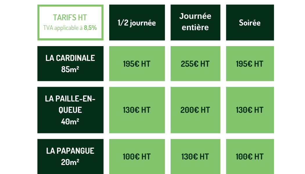 Optez pour la location d’une salle de séminaire chez Vert Tu Oses ! Idéalement situées à La Saline les Bains, nos trois salles modulables et modernes s’adaptent à tous vos besoins.